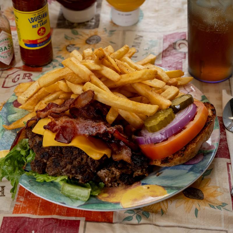 A big ground beef patty served on a bun with your choice of cheese, mayonnaise, lettuce, tomato, onion, and pickles.